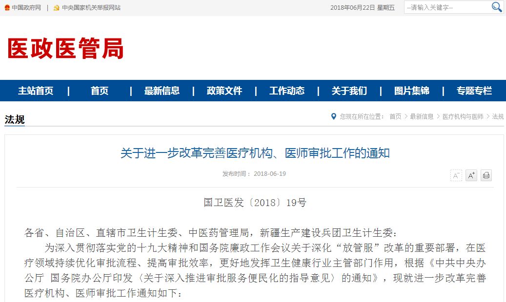 关于进一步改革完善医疗机构、医师审批工作的通知国卫医发〔2018〕19号