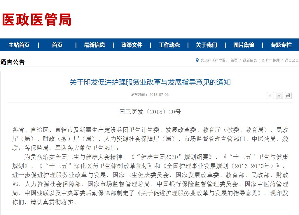为进一步促进护理服务业改革与发展,7月6日,国家卫生健康教育委员会、国家中医药管理局、人力资源和社会保障部等多部门联合印发《关于促进护理服务业改革与发展的指导意见》。