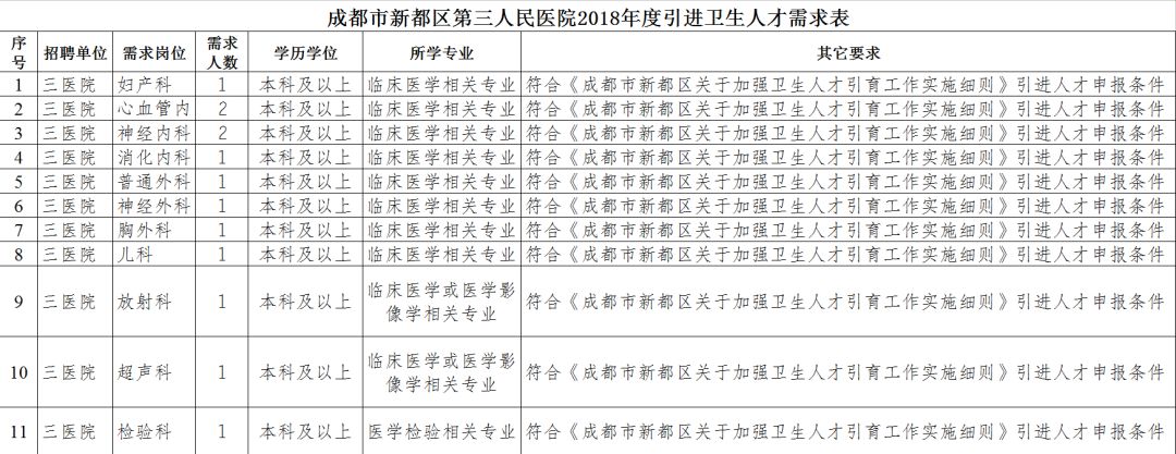 联系人:李老师联系电话:028-83911257地址:成都市新都区大丰街道崇义桥街468号医院招聘详情请关注微信公众号:成都市新都区第三人民医院